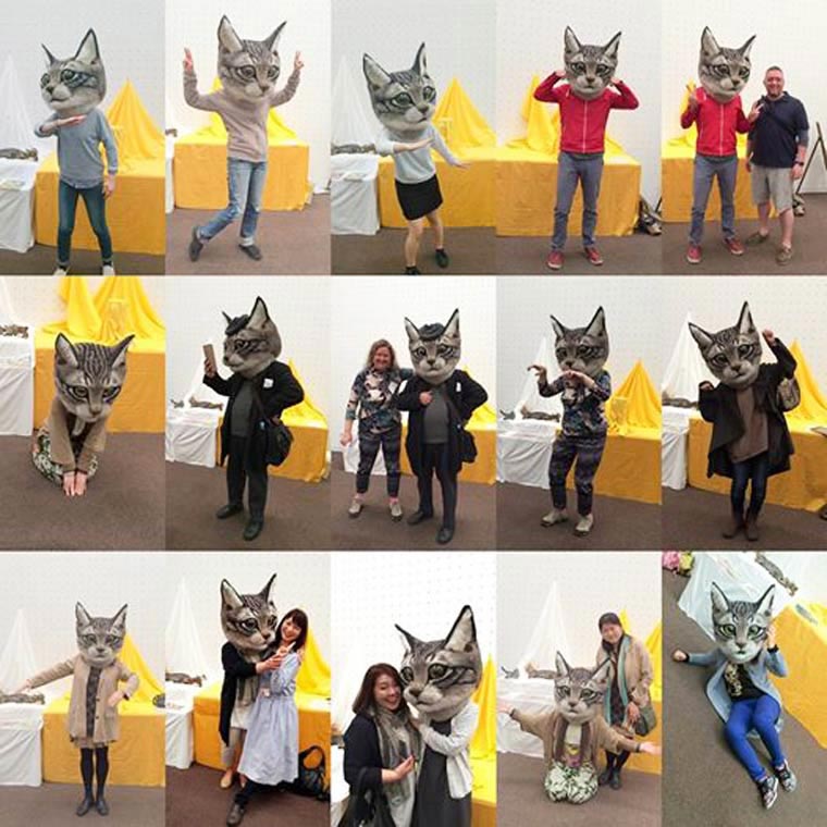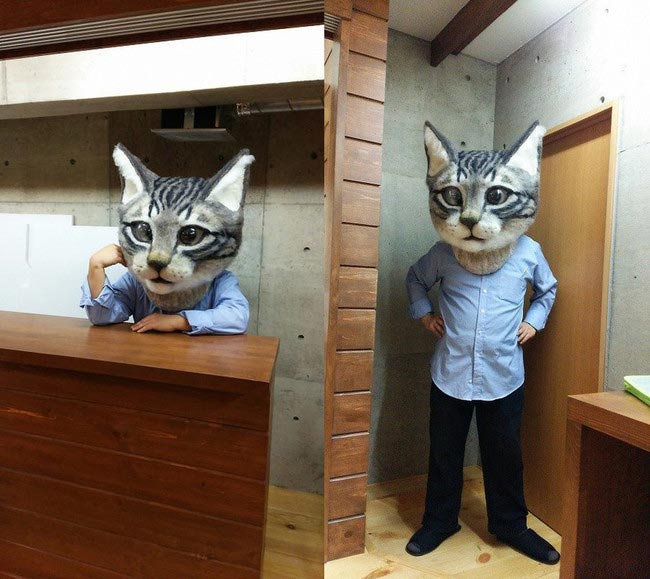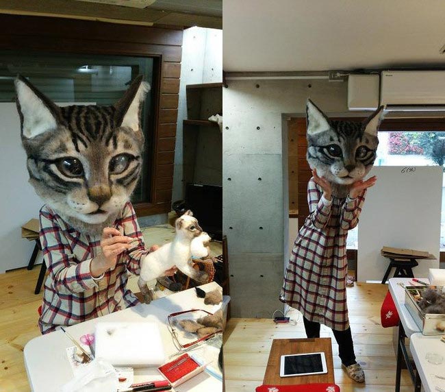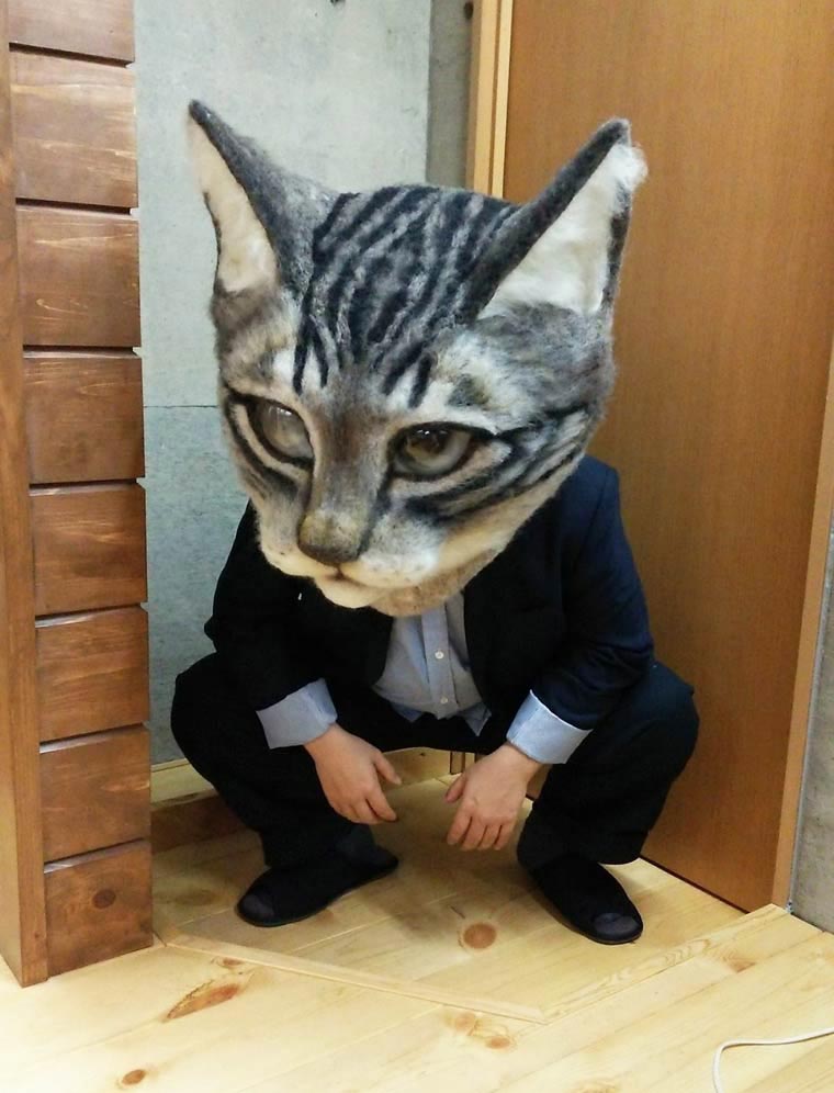 Эта гигантская и очень реалистичная кошачья голова из войлока была сделана руками Хаусету Сато (Housetu Sato), преподавателя "Японской школы шерстяного искусства". Хаусету сделал эту голову кошки при поддержке своих учеников специально для выставки в токийском музее искусства "Метрополитен". Огромная голова может носится в качестве маски и это выглядит немного пугающе, так как она превращает любого носителя в невероятный гибрид кошки и человека.