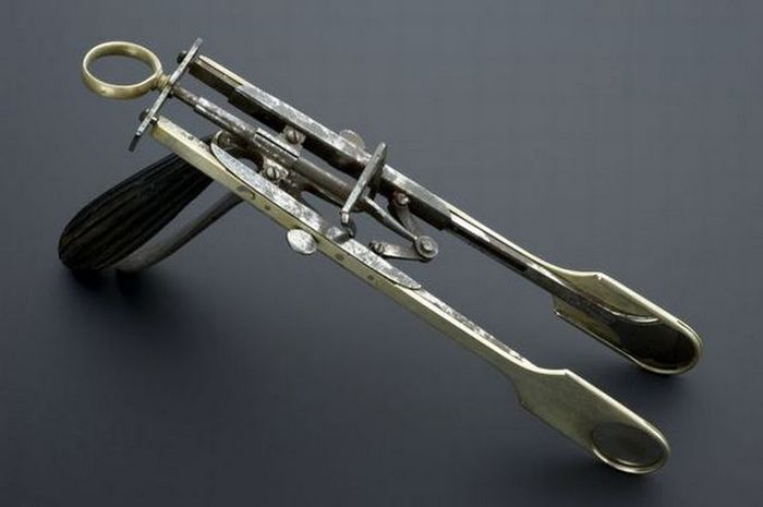 Лечение пиявками было настолько популярным в ту пору, что нужной живности стало не хватать. Лезвия искусственной пиявки прокалывали рану, а цилиндр с поршнем откачивали кровь.