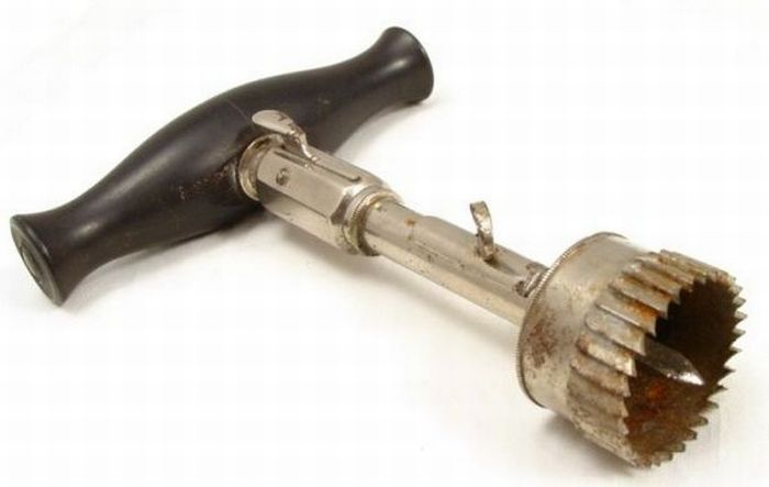 Предназначен для проделывания дыр в черепе. Работал по смешанному принципу дрели, штопора и пилы. Штырь в центре служил для начала сверления и впоследствии для удержания круглой пилы на месте, потихоньку входя глубже в черепную кость.