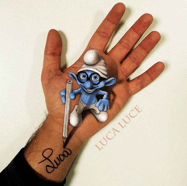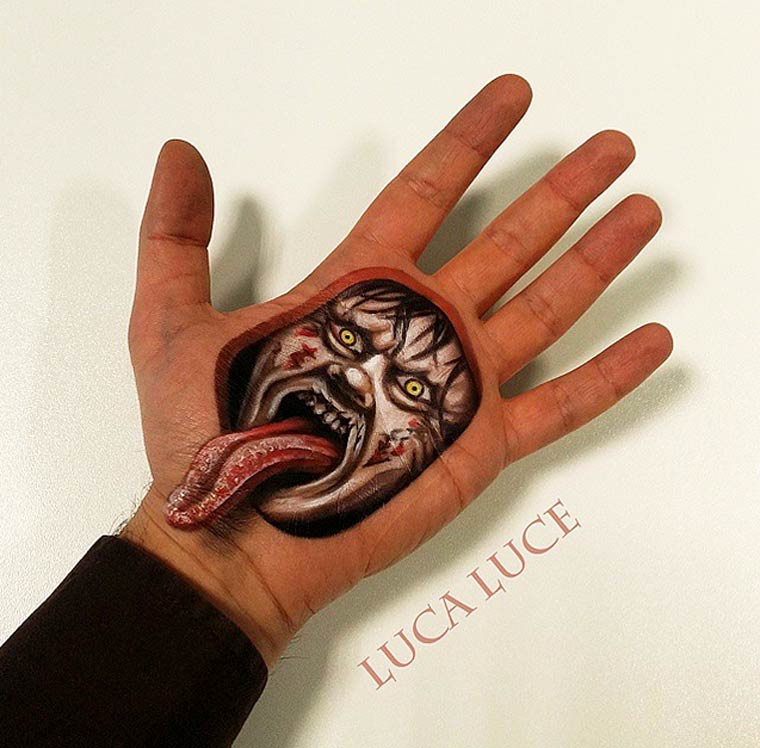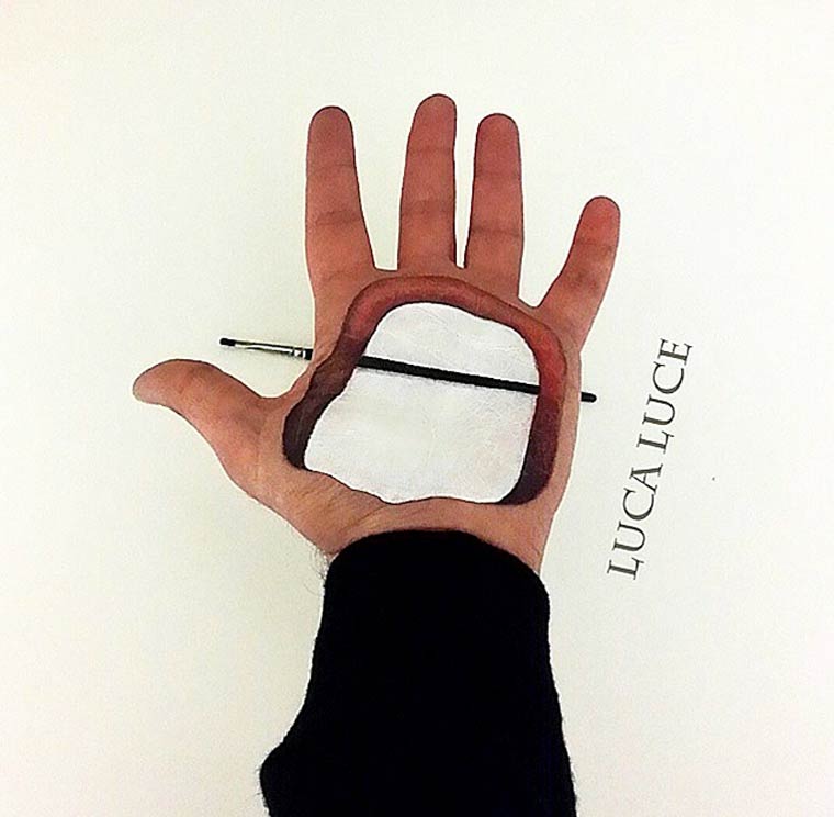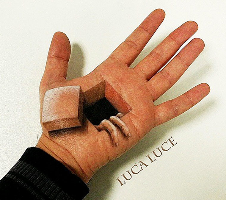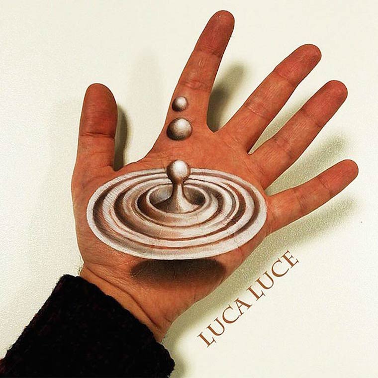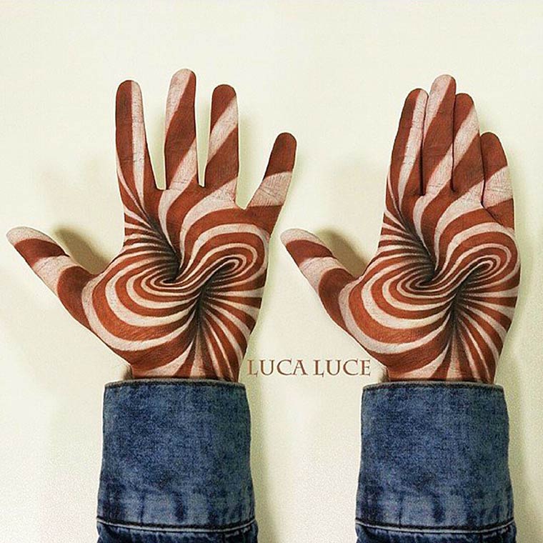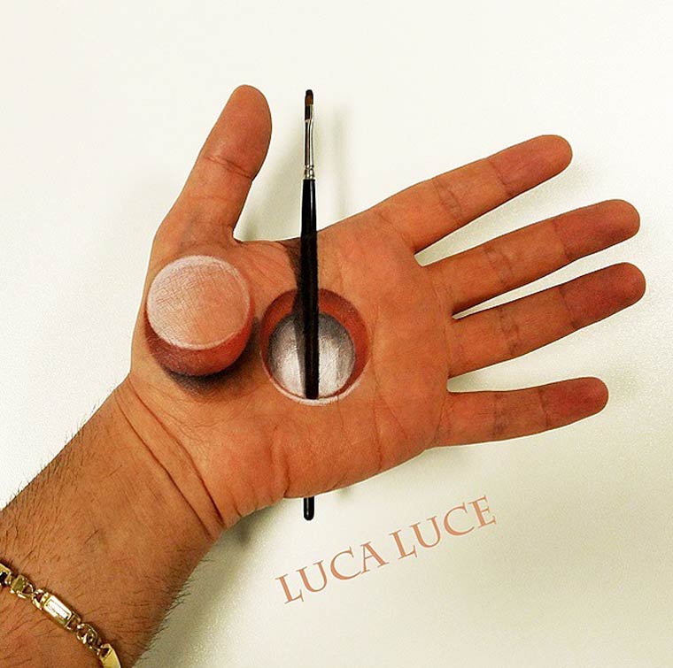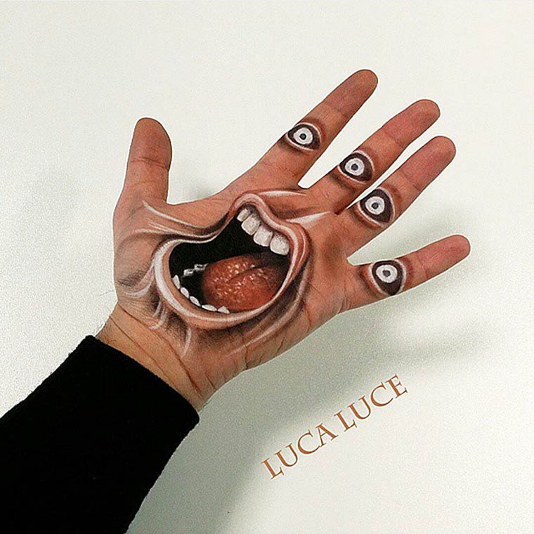 Все эти мозговзрывающие иллюзии были нарисованы руками итальянского визажиста по имени Лука Луче (Luca Luce). Лука должно быть пошел на сделку с дьяволом, потому что его объемные оптические иллюзии на руках обладают просто запредельной реалистичностью. Глядя на его работы с трудом верится, что всё это было нарисовано одной правой рукой, потому как левая рука во время рисования служит ему холстом.