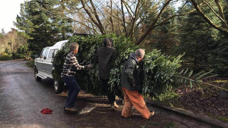 Ёлка была настолько большой, что понадобилось 6 человек, чтобы дотащить её до машины