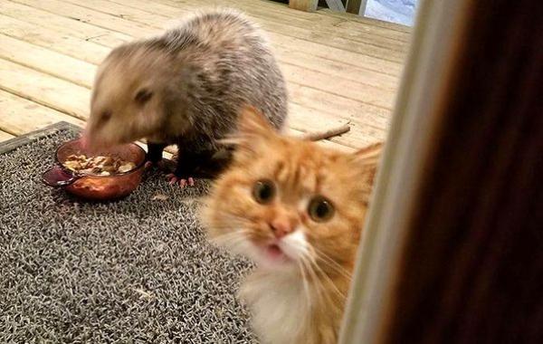 Реакция этого кота на опоссума, крадущего его еду, становится смешнее с каждой фотографией Смешное 12.03.2018 12408