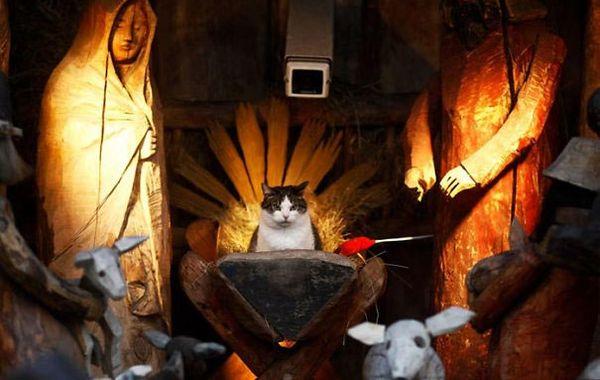 Люди не могут перестать смеяться над сердитым котом, занявшим место в рождественской инсталляции Смешное 07.12.2017 1755