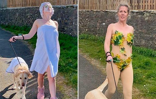 Женщина на карантине носит причудливые костюмы, гуляя с собакой, и пёс выглядит смущённым Смешное 14.04.2020 648