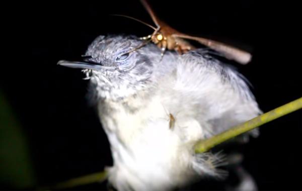 Мотылёк скрытно пьёт слёзы у спящей птицы, и да, они тоже этим занимаются Видео-приколы 02.10.2018 528