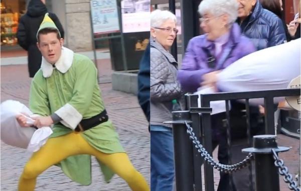 Парень в костюме эльфа устроил бой подушками со случайными прохожими (всем понравилось) Видео-приколы 08.12.2018 214