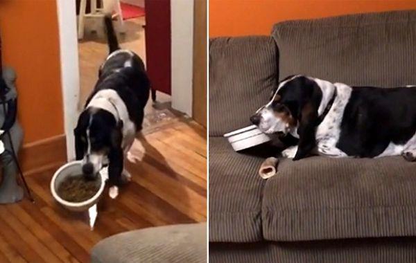 Пёсик принес полную миску еды на диван, чтобы съесть её с комфортом, и люди нашли в нем своё тотемное животное Животные 07.10.2020 158