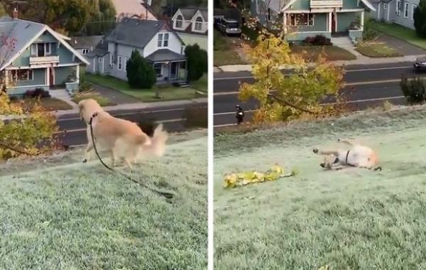Собака любит скатываться вниз со склона и выражение её мордашки бесценно Видео-приколы 19.11.2019 646