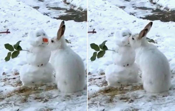 Кролик увидел снеговика с морковкой, не растерялся и сделал то, что на его месте сделал бы любой ушастик Видео-приколы 28.12.2020 549